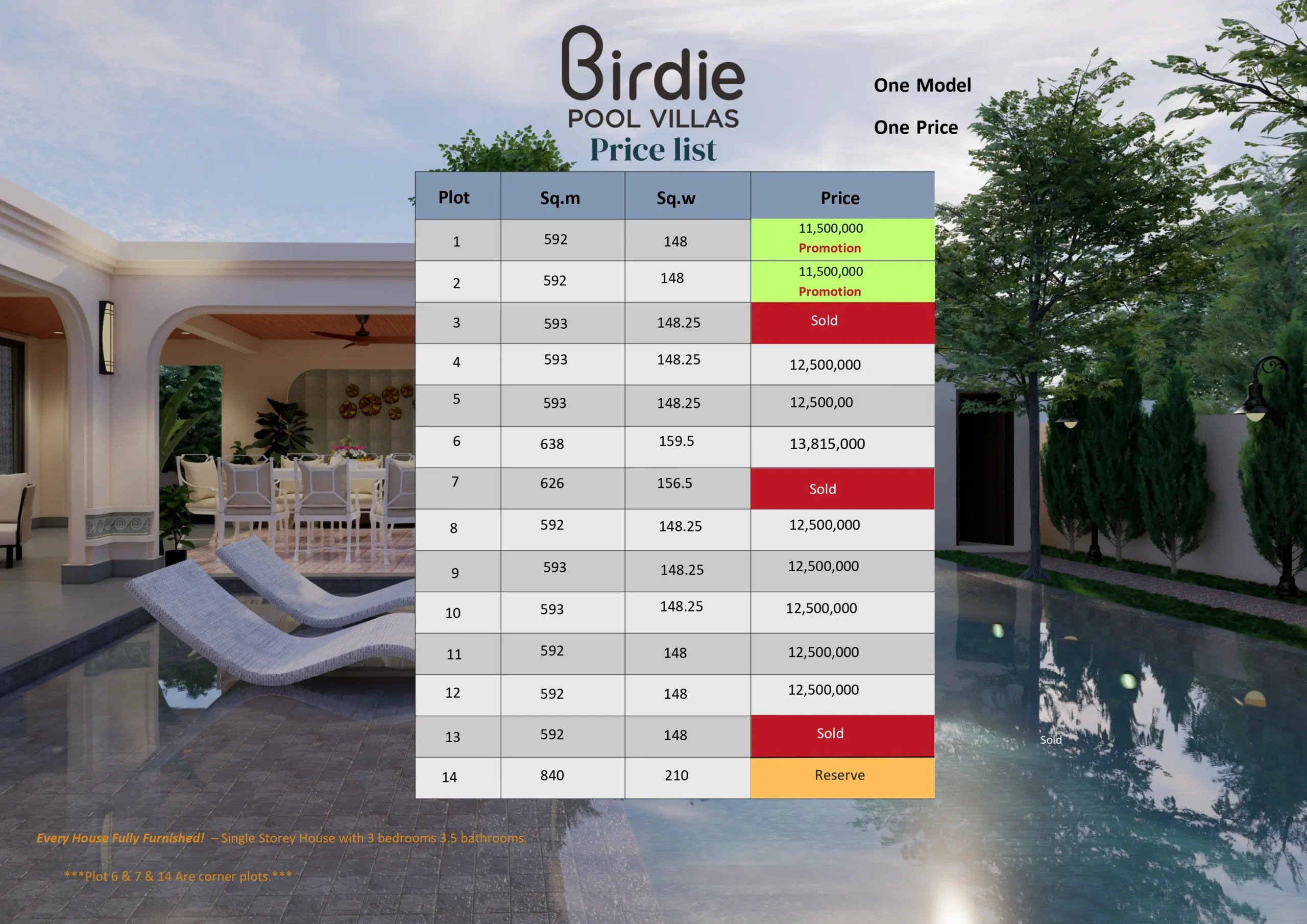 Yes, our show villa and sales office are open daily from 8:00 AM to 17:00 PM Customers can visit the Birdie Sales Office, or contact via phone at Mr.Udorn (+66) 818585965 and Ms. Wanvalee (+66) 993636393 or email at sales@birdiepoolvillas.com for inquiries.